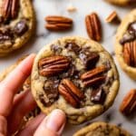 - Finish Cookies: While warm, press extra chocolate chunks and pecan pieces onto the cookie tops. Sprinkle with flaky sea salt if desired.