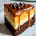 This Brownie Bottom Pumpkin Cheesecake is a decadent dessert combining a rich chocolate brownie base with a creamy, spiced pumpkin cheesecake layer. The dessert is finished with a drizzle of caramel sauce, whipped cream, and a sprinkle of pumpkin pie spice, offering a perfect blend of fall flavors and chocolate indulgence.