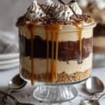 Keywords: caramel cheesecake trifle, brownie trifle, layered dessert, no bake cheesecake, caramel sauce dessert