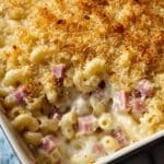 This Chicken Cordon Bleu Casserole is a comforting and flavorful dish that combines tender rotisserie chicken, creamy sauce, cavatappi pasta, and a crispy breadcrumb topping for a delicious twist on the classic Chicken Cordon Bleu.