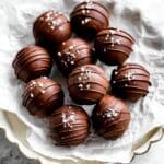 These Chocolate Brownie Protein Balls are a delicious and healthy snack combining creamy almond butter, rich chocolate, and protein powder for a satisfying, energy-boosting treat. Perfect for on-the-go or as a guilt-free dessert, they are coated in melted chocolate and sprinkled with flaky sea salt for an indulgent finish.
