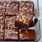 Keywords: chocolate peanut butter cake, sheet cake, peanut butter cake, chocolate cake, easy baking recipe, dessert, party cake