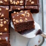 Keywords: Chocolate peanut butter cake, sheet cake, peanut butter chocolate cake, easy dessert, chocolate cake with peanut butter frosting