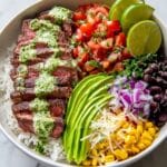 Cilantro Lime Steak Bowls are vibrant, flavor-packed meals featuring juicy marinated flank steak served atop a bed of lime and cilantro infused rice, complemented by black beans, charred corn, fresh vegetables, and creamy avocado. Topped with a zesty cilantro lime dressing and fresh lime wedges, these bowls are perfect for an easy yet impressive dinner that balances smoky, tangy, and fresh flavors.