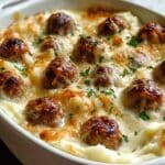 Keywords: meatball casserole, mashed potato bake, comfort food, easy dinner, baked meatballs, cheesy potato casserole