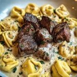 Keywords: steak tortellini, garlic cream sauce, creamy pasta, quick dinner, Italian comfort food