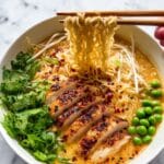 Creamy Marry Me Chicken Ramen is a flavorful and comforting dish combining tender, pan-fried chicken breasts with a rich, creamy broth infused with sun-dried tomatoes, garlic, and smoked paprika. Served over tender ramen noodles and topped with fresh cilantro, bean sprouts, edamame, scallions, and a drizzle of chili oil, this recipe delivers a perfect balance of creamy, spicy, and savory notes in one bowl.