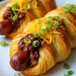 Keywords: crescent roll hot dogs, chili dog recipe, baked hot dogs, easy party snacks, cheddar cheese chili dogs