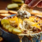 - Serve the dip with tortilla chips, slider buns, or pickle slices for dipping.