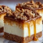 - Cool and Add Toppings: Remove from the oven and let cool for 10 minutes. Drizzle the salted caramel sauce evenly over the top of the cheesecake bars.