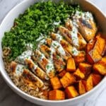 A wholesome and flavorful Chicken Sweet Potato Bowl featuring roasted sweet potatoes, seared chicken breast, and brown rice, topped with a creamy garlic tahini yogurt sauce. This balanced meal combines nutritious ingredients with simple cooking techniques for a delicious, satisfying bowl perfect for lunch or dinner.