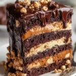 Keywords: Chocolate cake, peanut butter filling, cream cheese, chocolate ganache, dessert, easy cake recipe, indulgent cake