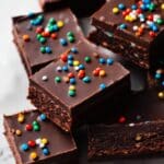 Delicious homemade cosmic brownies featuring a rich, fudgy base topped with a smooth chocolate ganache and colorful rainbow sprinkles, perfect for a delightful treat or party dessert.