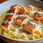 This indulgent creamy garlic salmon pasta combines tender seared salmon fillets with a rich, garlicky Parmesan cream sauce tossed with perfectly cooked fettuccine. It’s a quick and comforting meal perfect for a cozy dinner that feels luxurious yet easy to prepare.