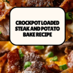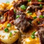 A hearty and comforting Loaded Steak and Potato Bake made in a crockpot. Tender beef steak cubes and diced potatoes are layered with crispy bacon bits and melted cheddar cheese, then slow-cooked with a creamy sour cream and garlic mixture. Finished with fresh green onions, this dish is perfect for a satisfying, hands-off meal.