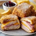- Serve: Lightly sprinkle the fried sandwich halves with confectioners’ sugar. Serve them warm, accompanied by red raspberry preserves and optional honey mustard for dipping, balancing the savory richness with sweet and tangy flavors.