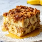 Keywords: banana French toast casserole, overnight French toast, baked French toast, breakfast casserole, streusel topping, banana breakfast recipe