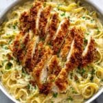 This Parmesan Crusted Chicken with Alfredo is a flavorful and comforting dish featuring tender chicken breasts coated in a crispy Parmesan and breadcrumb crust, baked to perfection, and topped with a rich, creamy homemade Alfredo sauce. Garnished with fresh parsley, this recipe combines the satisfying crunch of crusted chicken with the indulgent smoothness of cheesy sauce for an irresistible meal.