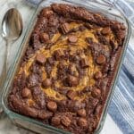 A dump cake is a simple dessert where you “dump” all ingredients into a bowl or baking dish and bake without complicated mixing or layering. This version uses pudding and milk mixed with cake mix and peanut butter cups, resulting in a moist, fudgy cake.