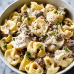 Keywords: Philly cheesesteak tortellini, creamy pasta, easy dinner recipe, ground beef pasta, cheese tortellini, comfort food