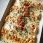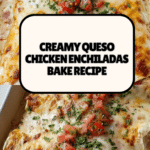 Queso Chicken Enchiladas Bake is a comforting Tex-Mex dish featuring shredded chicken mixed with creamy sour cream, cheddar, and taco seasoning, all wrapped in soft flour tortillas. Smothered in a velvety queso blanco Velveeta sauce with tomatoes and green chilies, these enchiladas are baked until bubbly and packed with rich, cheesy flavor. This recipe is perfect for busy weeknights when you want something hearty and satisfying on the table quickly.