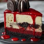Indulge in this luscious Red Velvet Oreo Cheesecake, combining the rich flavors of red velvet and Oreo cookies with a creamy cheesecake base. Featuring a buttery Oreo crust, a vibrant red cheesecake layer, and a smooth cream cheese frosting topped with crushed Oreos, this decadent dessert is perfect for special occasions or a delightful treat any day.