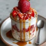 Delicious and creamy Strawberry Cheesecake Overnight Oats made with rolled oats soaked overnight in almond milk, mixed with a luscious cream cheese and Greek yogurt blend, fresh strawberries, chia seeds, and a hint of honey and vanilla. This wholesome and easy-to-make breakfast or snack offers a perfect balance of protein, fiber, and antioxidants, served chilled with optionally crushed graham crackers for a delightful cheesecake finish.