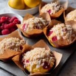 Store cooled muffins in an airtight container at room temperature for up to two days. For longer freshness, refrigerate them covered. Muffins freeze well individually; thaw and warm them in a toaster oven or regular oven to revive the crumb topping’s crispness before serving.