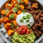 A vibrant and hearty Sweet Potato Taco Bowl that combines roasted sweet potatoes, seasoned ground beef, fresh pico de gallo, creamy guacamole, and tangy sour cream. This easy-to-make dish is perfect for a flavorful weeknight dinner, offering a balanced mix of textures and bold Mexican-inspired flavors.