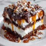 Turtle Earthquake Brownies are a deliciously decadent dessert featuring a rich, fudgy brownie base topped with melted semi-sweet chocolate chips, luscious caramel sauce, and crunchy chopped pecans. This recipe combines classic brownie flavors with the sweet and nutty texture of a turtle candy topping for an irresistible treat perfect for any occasion.
