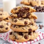 These ultra thick bakery style chocolate chip cookies deliver a perfect balance of chewy and soft textures with rich caramelized flavors. By chilling the dough and using a mix of semi-sweet and dark chocolate chips, these cookies achieve a decadent, indulgent taste and the iconic thick, bakery texture that keeps you coming back for more.