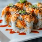 Store any leftover sushi rolls covered tightly with plastic wrap in the refrigerator for up to 1 day to maintain freshness. Reheat the roll uncut under the broiler for a minute to warm the topping if desired, but sushi rice is best enjoyed fresh. Avoid freezing as it can alter the texture of the rice and seafood.